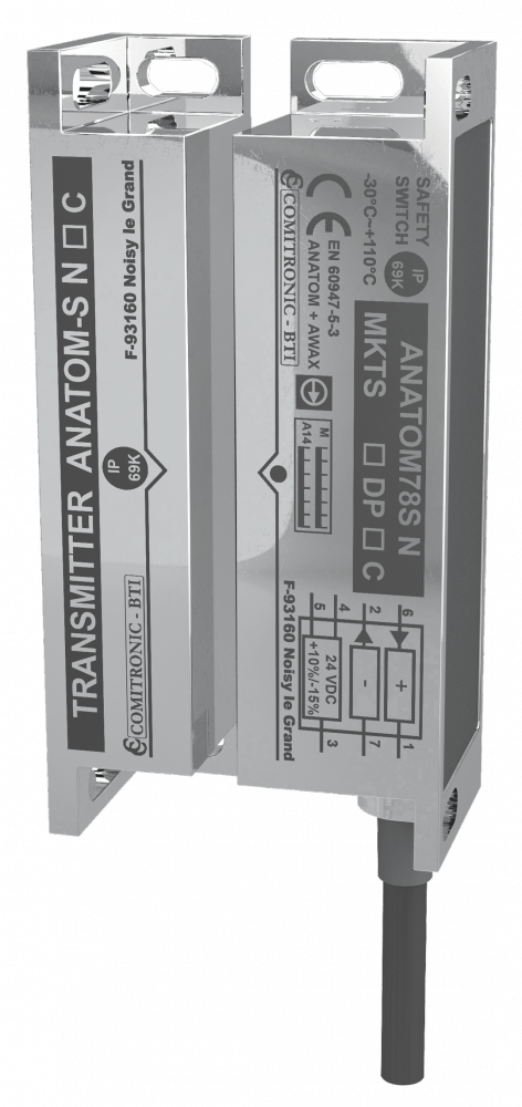 ANATOM78S-N-MKTS - Comitronic, nieautonomiczny, magnetyczny wyłącznik bezpieczeństwa. Wykonany w obudowie ze stali nierdzewnej 316L. Długość przewodu: 50cm, złącze M12. Styki: 2NO + 1NC.