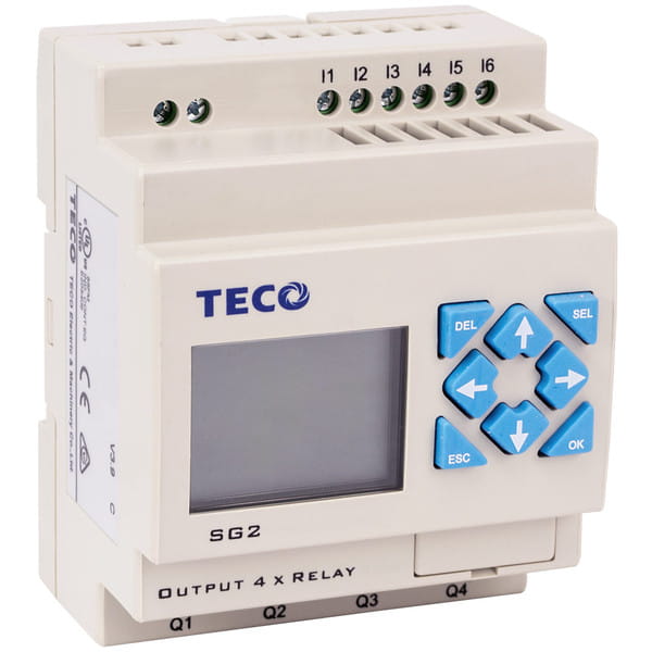 SG2-12HR-12D - przekaźnik programowalny TECO SG2. Posiada: 8 wejść cyfrowych, 4 wyjścia przekaźnikowe, zasilanie 12VDC. Posiada wbudowany wyświetlacz LCD (4 linie po 16 znaków) wraz z klawiaturą. Możliwość programowania z wyświetlacza lub z komputera (darmowe oprogramowanie)